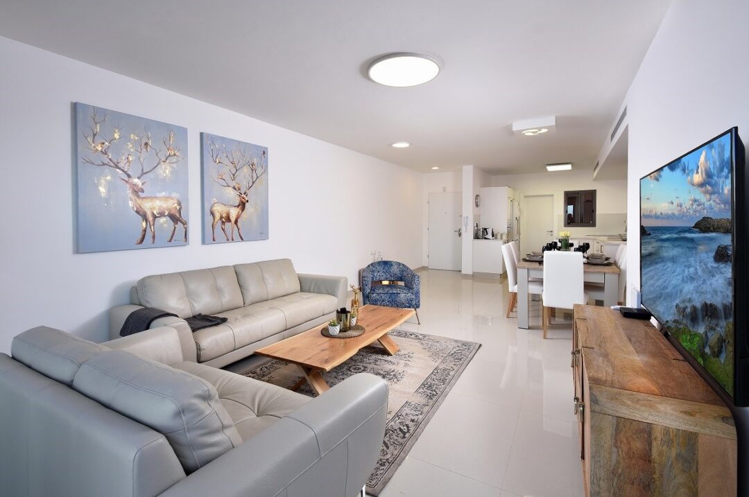 סלון עם ספה נפתחת, טלוויזה ושולחן עם 8 כסאות
