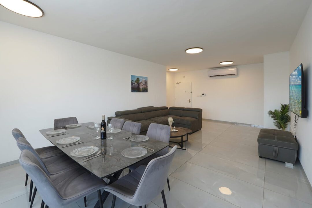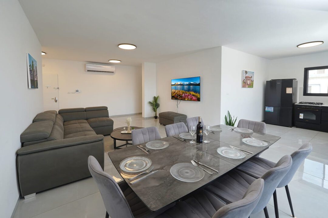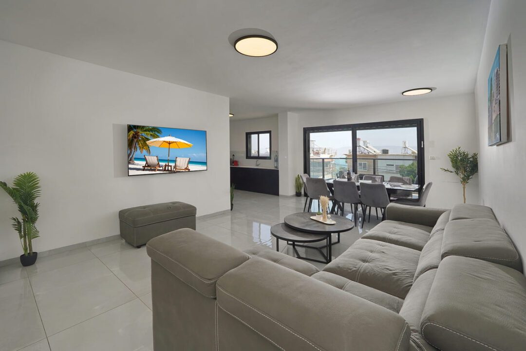סלון מרווח ומפואר עם ספות ופינת אוכל מרווחת